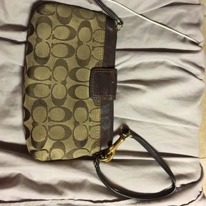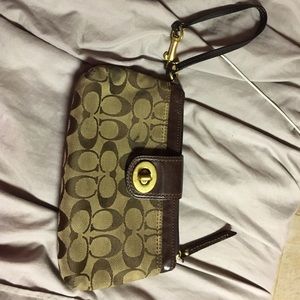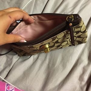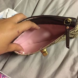 Used brown fabric and leather Coach clutch! Large size, can easily fit iPhone 6s Plus even more with it!! Has card slot and inside is pink silk.