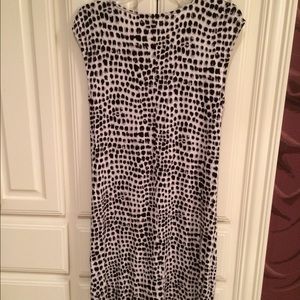 Black, white & gray print knee-length dress cinched at the bust for a v-style neckline. 95% rayon & 5% spandex. Machine washable dry flat. Length is 40 1/2".