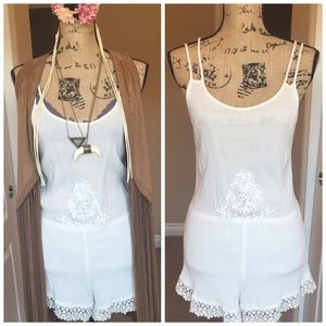 😍Beautiful White Romper 😍. In EUC! I have only worn it a couple of times. I LOVE it!! But, I also have a lot more junk in the trunk than I used to so, it's a little too "cheeky" for my liking. Lol. Super soft. 100% Rayon. Top is a little sheer but not too much, bottom has a solid layer under the top layer. Also, the "suede" fringe vest is for purchase! Needs a quick stitch on the left side. Bundle for discount! Open to reasonable offers. 💕