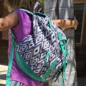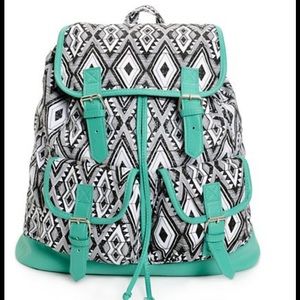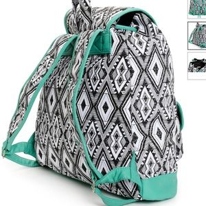 Black and white canvas with mint synthetic leather trim cinch top rucksack backpack. Black Taffeta lining; with magnetic snap closures; lightly padded adjustable shoulder straps, and top handle loop.