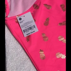 Osh Kosh B'Gosh 2-piece bright pink with gold foil pineapples throughout. Tankini top has neck clasp closure and double ruffle layer on the front neckline. Matching bottoms provide full coverage. Both pieces are fully lined in the front. 100% polyester exterior. Run true to size. For instance: Size 6 tag states : Ht 45-48", Wt 45-49 lbs, UPF 50.