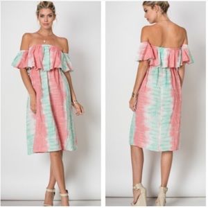 Brand New Never worn . Pretty pastel Chic Off shoulder ruffle tie die print Midi dress. Elastic neck and waistline . True to size loose fit . 55% Cotton, 45% Rayon. Unlined . Premium Quality Merchandise. Model is 5’3 wearing size small.