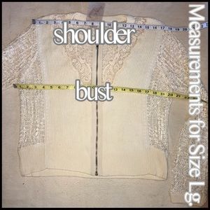 This Lightweight Open Weave Cardi is has exquisitely detailed crocheted lace on the front; Bronze toned zipper pull; versatile, very high quality cardigan.