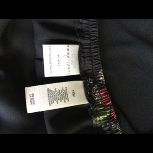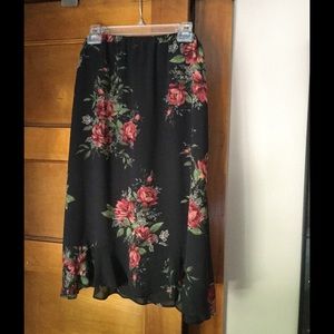 Cute gauzy floral skirt. Falls well below the knee. Skirt is mostly straight but there is a ruffle at the bottom. Full elastic waist. Tag says 18W but it was tailored down to fit a large 14 small 16