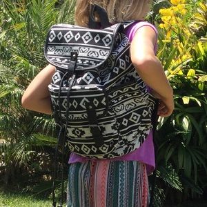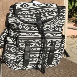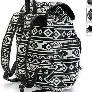 Black and white print canvas rucksack backpack with black synthetic leather trim.