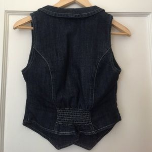 Low cut denim vest, dress it up or down! Three buttons in front. Worn only a few times, still in great condition. Can fit a woman or juniors. Willing to negotiate!