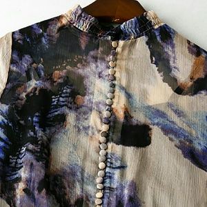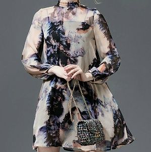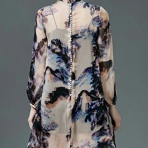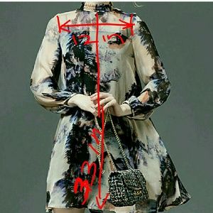 Romantic silk A cut, nice combination of deep print colors, two piece, wide style would fit from a size 4 to possibly an 8 size if you have small upper body frame), i have included a pic w measures. shoulder 12", length 33", its very pretty dress/tunic, can be used as a dress or blouson with leggings. NwoT