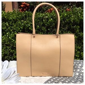 Rebecca Minkoff Medium M.A.B. beige leather tote with rose gold-tone hardware, dual rolled shoulder straps, hidden zip pocket at center, triple interior wall pockets; 1 w zip closure and snap closure at top. Approx Measurements Shoulder Strap D: 7”, H: 11.75”, W: 14”, D: 4.75”. SOLD OUT! Minimal wear on leather. See pics! Condition: Excellent. Includes dust bag.