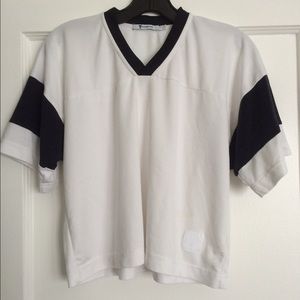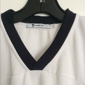 Lightly worn jersey top from t . Navy and white color blocking. Rib trim at neck. Very subtle discoloration at lower front body( can barely see in the photo because it's very light, can probably be washed out ) and tiny pull at front body around stomach area, see last photo(again super subtle) size xs ! No returns !