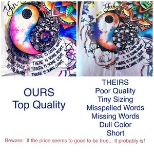 @amberfletcher2 Yes, there are horrible knockoffs of this top across the internet.  I have posted a photo of an example of the quality difference.  Side by side, the ripoff shirt is tiny... infant sizing almost.  Words are missing and misspelled, fabric is thin, color is faded.  $6 is way too much, in my opinion.   They aren't wearable.  Ours is top quality.  Please see our Love Notes for so many nice review comments.
