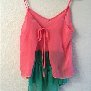This is a sheer pink and green top. The pink part is open in the back so it's really cute and flattering.