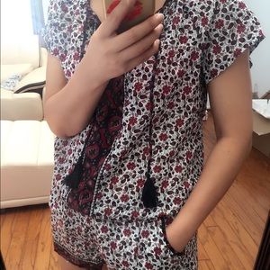 New with tag, never worn. Super cute! Madon romper in printed crinkle cotton features a split v-neck with two front hanging tassels, gathered elastic waist and blouson top.