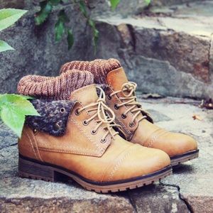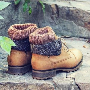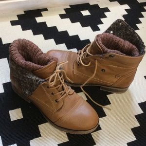 Cozy Tan lace up boot. Size 7.5 fits more like 7. Laces and sole are a little worn but everything else is in great condition.