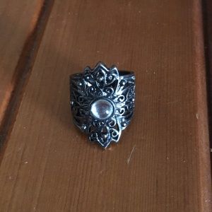 Super embellished metal ring with rhinestone accent. Good condition, purchased from Francesca's about 2 seasons ago.
