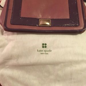 Mauve leather bag with more of a light eggplant vinyl trim and gold hardware. Comes with purse bag. Barely used! Adjustable strap, 2 interior slip pockets, one interior zip pocket. 14"L x 4"W x 8"H