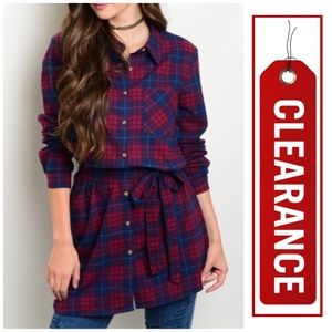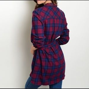 Long sleeve button down plaid shirt with self tie belt. Made of 100% cotton.