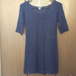 Dark blue open knit long length sweater with short sleeves and stretched-knit stripes down the front