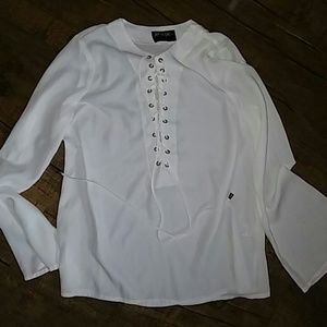 Lace up top with small hoops. Loose fitting. Semi sheer. Last M and S available have a small stain. $12 b4 sale