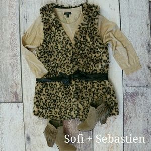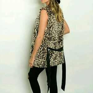 Leopard print open front faux fur vest belted