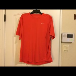 Nike Dri-Fit Challenger Running Shirt Sz Large. It is in very good condition. There are a couple of pulls in the material but hardly noticeable. Fabric is breathable moisture wicking mesh fabric. Color is bright orange. 100% recycled polyester. Smoke-Free home.