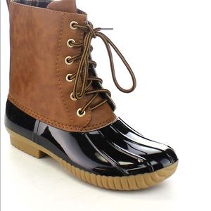 New in box BLACK Dylan duck boot, upper leather tan , great for upcoming fall, High top ankle duck boots stitching details and cushioned footbed. These shoes runs small for wide feet go up one size would be better, brand yoki, Adriana