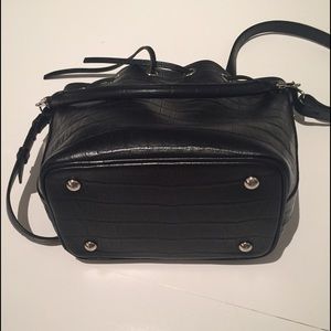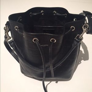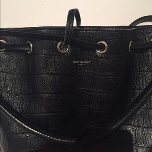 Currently listed on eBay starting at $99. I'm trying to empty my closet! Barely worn black Saint Laurent bucket bag in Croc called the Emmanuelle. Silver finishings, with a zipper pocket on the side. Croc embossed calfskin leather with suede lining. Measures 6" width, 7" height and 4.5" diameter. Detachable handle measures 11" with a 2.5" drop. Adjustable and detachable shoulder strap.