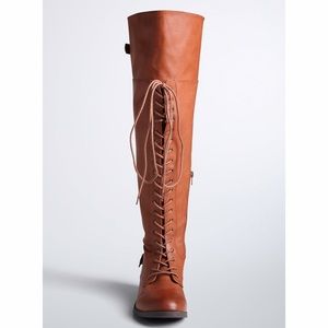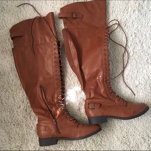 No way we're over over-the-knee boots; we're just starting to fall in love this fall. A riding boot style in smooth cognac leather gets an old-world vibe from the sky-high lace up front. Gold tone buckle straps wrap around the ankle and top of the boot. Worn once for an hour. Still has the sticker on the bottom.