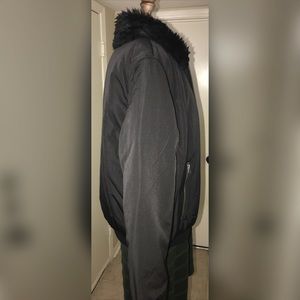 A luxe mixed-material bomber jacket, featuring front zipper closure, slanted zipper pockets, and faux fur collar . Long sleeves.