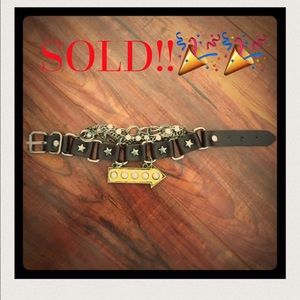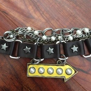Another Incredible Jenn Bratty piece, this one a leather bracelet with silver hardware and stars as well as added beads and chains and a yellow one way sign adorned with pearls! A one of a kind and you won't be able to find this anywhere else. This is a local artist, Jenn Bratty, who spends hours and days on each piece and pours her heart and soul into every item she designs. They are not mass produced but one of a kind pieces! As such, the price is firm on these designs.