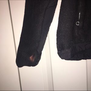 Used black north face jacket. This is the version with no hood. Small bleach stain on the right sleeve, as pictured.
