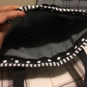 Hello Kitty insulated lunchbox. Small. I like big lunches so it was too small for me. Has small pocket in front, and main compartment zips closed. Used a few times until I realized I like to take more food than this holds.
