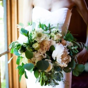 Elegant dress that can be accessorized to suit any bride. An ivory strapless cotton silk faille mermaid with a built in corset, sweeping train, and sweetheart neckline. I got the dress taken in (I was between 0 and 2; I am 5'3" and was 100 lbs back then) and hemmed (5'3" and wore 3.5” heels). Dry cleaned twice after event. Small hole in the inner tulle lining in the back.