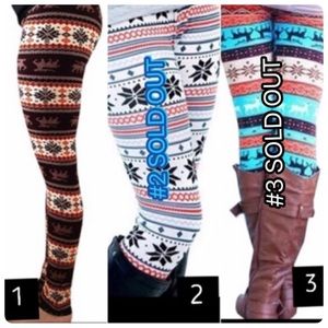 Adorable printed leggings. One size fits most. Cotton and polyester - super soft! Ankle length. These are perfect for the holidays! White snowflake is sold out, I have one left of #1 and #3