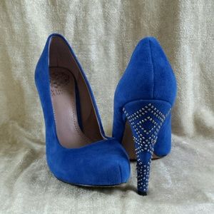 Stunning cobalt blue suede heels with stud design on the heel. Worn once when I was trying out the pointy toe craze. True to size and comfy but that pointy toe isn't me. 4.25" heel, 1/2" hidden platform. Excellent condition!