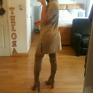 A trendy taupe/olive oversize tee. Has rips for design and side zippers that work. This is a MEN'S size Medium Tee but fits me Perfectly as a dress. I wore shorts under mine. I listed it as a S/M because i feel a woman who is either or can fit into this as a dress.
