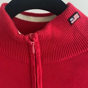 Red, white and black 100% cotton sweater. Logo on the collar. Lovely classic RL sweater with a sporty flair. EUC.