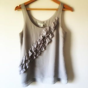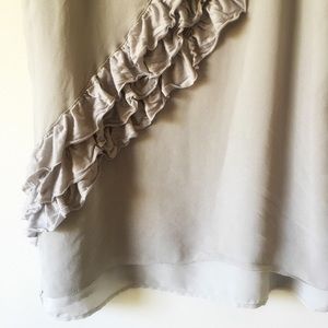 Delicate and beautiful silk blouse. Two layers, bottom layer peeks out at bottom hem. Asymmetrical ruffles that wrap around hip. 20" pit to pit. 25" shoulder to bottom of hem. Shell: 100% silk. Lining: 100% polyester. Good preloved condition.