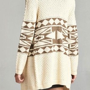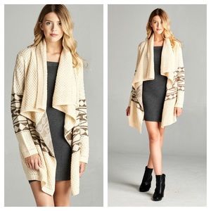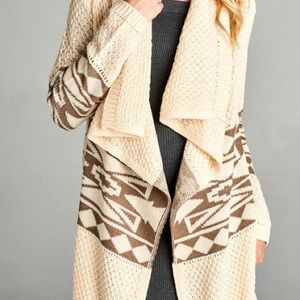 Light Cream and Mocha Geo Patterned Cardigan Sweater. Long Sleeve with a Draped Open Front. Medium Weight. Shop here or at www.shopbelovedboutique.com ❤️