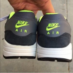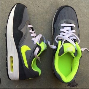SALE PRICE. NO OFFERS PLEASE. New never worn Nike AIR MAX ONE SIZE 5.5 youth. (Aprox equivalent to size 7 woman's) please know what size you wear in youth sizes before ordering. Grey suede with VOLT accents.
