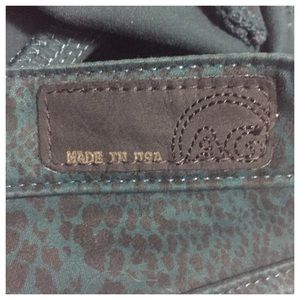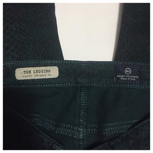 Super skinny deep teal green jeans with subtle snake print by AG Adriano Goldschmied. ONLY SIZE 27 LEFT
