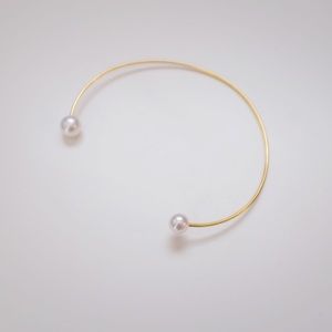 A slim open-ended choker sports medium-sized pearls for a modern rendition of the traditional pearl necklace. Measurement: Length: 11" with adjustable 3.5" opening.