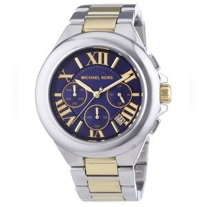 Michael Kors Camille Blue Dial Two Tone Chronograph MK5758 Ladies Watch. In great condition, minor scratches throughout, worn for a few month and in need of a new home. Comes with box. Does not include extra links. 100% authentic purchased from Bloomingdale's