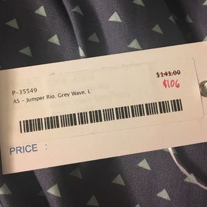 Ava Sky jumper. Only worn once but has light piling by underarms. Halter style with elastic waist band. Has pockets. It's a blue grey color with white.