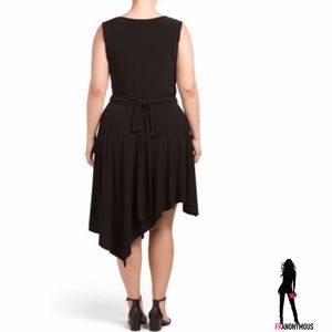 From Taylor. Fabulous LBD! Black jersey dress with pleated front, tie waist. Fabric provides stretch for fit and comfort. Sleeveless, scoop-neck tank style top. 49" long (size 14W). Asymmetrical hem. Dress pulls on. Poly/spandex blend. Machine wash. 14W, 16W, 18W