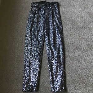 **SOLD** Milly Sequined tulle straight leg pants. Size 0. *Worn Once*. Perfect for upcoming Holiday party Season! Silver & Black sequin w/ bow embellished leather belt. Satin lining ensures a smooth fit. Concealed hook & front zipper. Best worn with a tucked-in blouse.