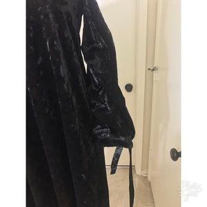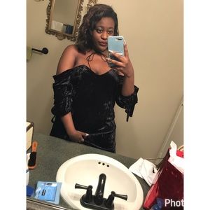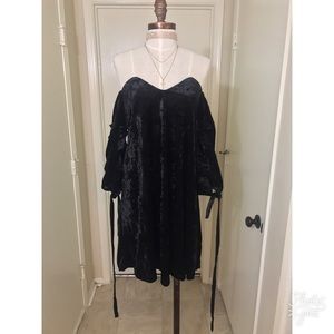 A luxe crushed velvet dress with an elastic off-shoulder neckline and half sleeves. Finished knee-length hem. Unlined.