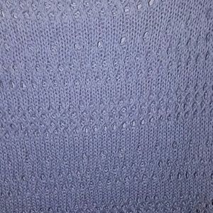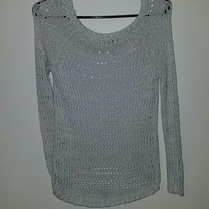 Light grey knit sweater with holes. Low scoop neck and high low with a loose fit (except the sleeves).