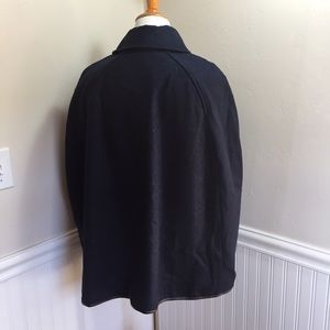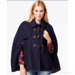 Maison Jules Faux-Leather-Trim Toggle Cape. 82% polyester 6% wool 5% acrylic 7% other fibers. Trim not leather. Perfect for anything. Fits loose. Fabric feels like wool. Navy blue with brown trim. Medium bust is about 31 inches, obviously the design allows for room. The medium is about 34 inches long. Maison Jules Faux-Leather-Trim Toggle Cape. B61