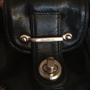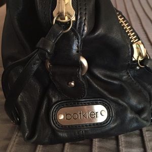 Black, all leather, satchel. 2 front pockets with zippers. 2 interior leather pockets and a large inside pocket with zipper closure. 2 top handles. Can be worn on the shoulder. Beautiful metal closure on front flap.