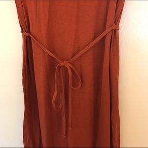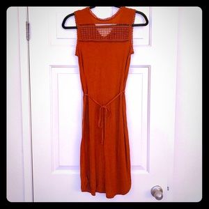 Beautiful burnt orange-colored dress 🍊 with beautiful crocheted detailing around the neckline. Ties are removable. Barely noticeable minor defect shown in last photo and reflected in price.